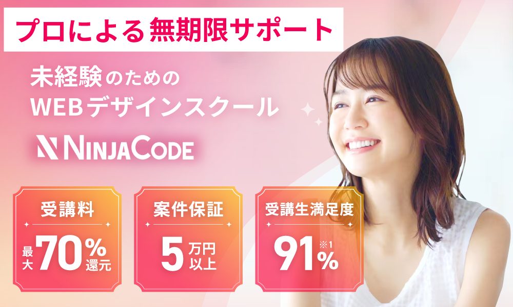 忍者コードは忙しい人にも安心のWebデザインスクール。一度授業を購入すれば永久的に教材が利用可能なだけでなく、サポートも無期限、忙しくて毎日勉強出来ない人でも自分のペースでじっくり学習が可能。サポートは24時間チャット質問や、1対1の技術相談ができます。案件保証もあり、副業・案件獲得保証プランでは5万円分、フリーランスプランでは10万円分の案件を100%獲得できます。さらに業務委託の年間契約を必ず締結できるので、単発の案件を受けることも可能 です。サポート体制が手厚く、独学でWebデザインを学んだけれど過去に挫折したことのある人が、改めてWebデザインに挑戦するにも相性の良いスクールです。